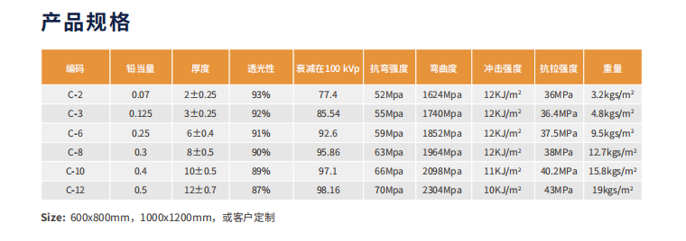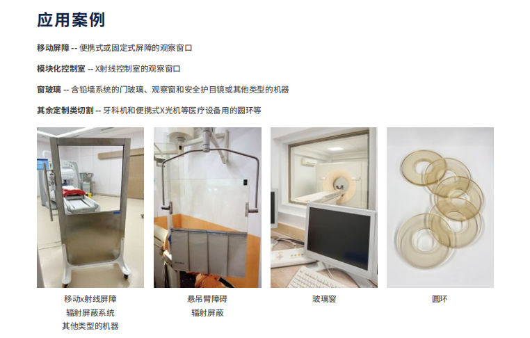 优势 有不同的铅当量和厚度的选择 坚固耐用,防破碎 可切割,钻孔或机械加工,适合常规的塑料处理技术 高性能的辐射防护效果 超透光性 定制切割